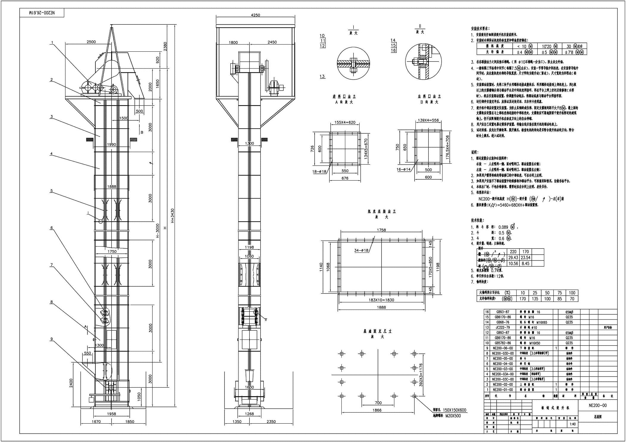 [NE200斗式提升機(jī)總裝圖]  [NE200斗式提升機(jī)外形圖]  [NE200斗式提升機(jī)地基尺寸]